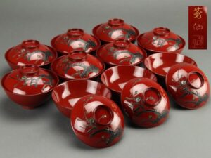 Foto: Set de sake Aizu-Nuri din lemn de pin, bambus, prun, culoare negru și roșu lăcuit, JAPONIA