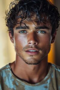 Casca căzu într-o mână, iar din sub ea ieșiră bucle ciocolatii presărate cu șuvițe aurii, care se ridicară ușor în bătaia vântului. Tenul său bronzat, aproape perfect, sclipea sub lumina de amiază. O linie de zâmbet i se așeză în colțul gurii, și ochii lui verzi, intens deschiși, străluciră.